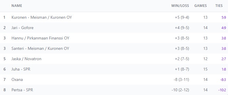 Yritysliigan seitsemäs kausi lähti liikkeelle vasta huhtikuussa, kun olimme vähän siinä ja siinä kannattaako yritysliigaa jatkaa vähäisen osallistujamäärän vuoksi. Saimme kuitenkin mukaan uuden osallistujan Suomen Punaisen Ristin ja myös suurin osa vanhoista osallistujista lähti mukaan, joten päätimme myöhässä aloittaa kauden pitäen ensimmäisen vuosipuoliskon osakilpailut huhti-kesäkussa. Valitettavasti ensimmäiseen osakilpailuun ei saatu kovin paljoa osallistujia, mutta kisa kuitenkin saatiin pienemmällä väkimäärällä pidettyä. Aiemmin erikseen toimineet Meisman ja Kuronen päättivät yhdistyä ja heillä on nyt kahden pelaajan joukkue Kuronen – Meisman nimellä. Tämä tuottikin hyvän tuloksen ja ensimmäisestä osakilpailusta tuli voitto ja täydet 10 pistettä. Gofore tuli hienosti toiseksi ja Pirkanmaan Finanssi kolmanneksi. Tästä on hyvä jatkaa ja toivotaan seuraaviin osakilpailuihin lisää osallistujia ja tietysti myös uusia firmoja, niin saadaan kunnon kisailut tuleviin osakilpailuihin.