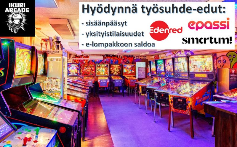 Ikuri Arcadella voi maksaa Edenredillä, Smartumilla ja ePassilla sisäänpääsymaksuja ja yksityistilaisuuksia. Uutuutena voit ostaa myös elektronista saldoa Ikuri Arcaden e-lompakkoon. Saldoa voit käyttää esimerkiksi sisäänpääsymaksujen maksamiseen koska vaan myös tulevina vuosina. Hyödynnä nämä mahdollisuudet vuoden 2022 puolella ennen kuin saldot vanhenevat. Maksu onnistuu paikan päällä, mutta myös etänä. Riittää kun otat kuitista kopion kännykän kuvan kaappauksena ja lähetät meille WhatsApp kautta 040 374 7093 tai sähköpostitse: ikuri.arcade@hotmail.com