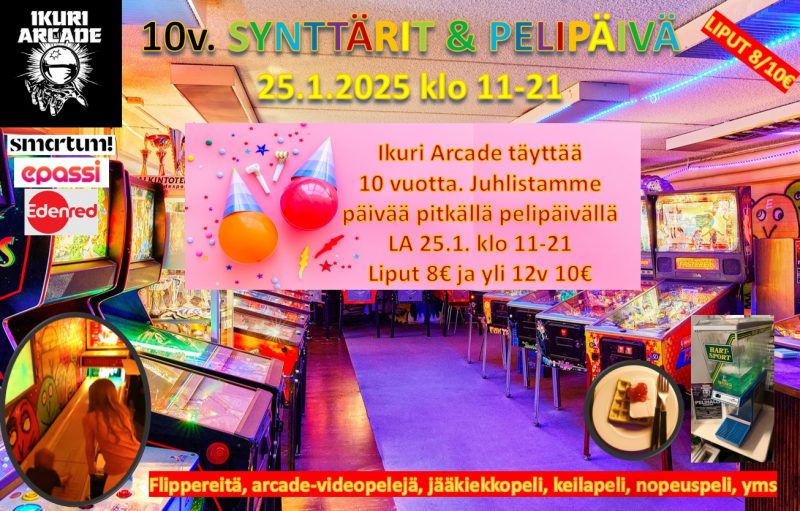 Ikuri Arcade juhlistaan 10 vuotispäiviään lauantaina 25.1.2025 klo 11-21 pitkän pelipäivän merkeissä. Ovet ovat avoinna kaikille ja liput maksavat 10 euroa (lapset 12 ikävuoteen saakka 8 euroa).