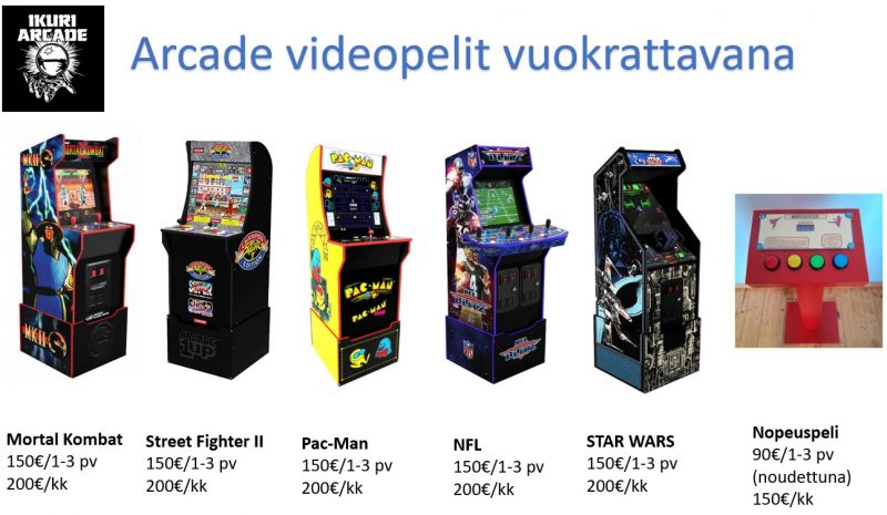 Ikuri Arcadelta voit vuokrata flipperin tai arcade videopelin kotiin, työpaikalle, tapahtumiin, yms. Vuokraamme ainoastaan hyväkuntoisia uusia pelejä joiden toimintavarmuus on korkeaa luokkaa. Hinta sisältää aina kuljetuksen Pirkanmaan alueella, pelin kasaamisen sijoituspaikassa, opastuksen, huollot vuokra-aikana ja vuokra-ajan päätyttyä poiskuljetuksen. Vuokrahintaan vaikuttaa pelin ikä sekä taso (flippereissä onko Pro vai Premium). Minimivuokra-aika on yksi kuukausi, mutta vuokraamme toki lyhyempiinkin tilaisuuksiin 1 kk vuokrahinnalla. Vähintään kahden kuukauden vuokra-ajalle annamme kk-hintaan 50 euron alennuksen flippereissä ja 20 euron alennuksen arcade videopeleissä. Useamman koneen vuokrauksista annamme myös alennusta ja lasketaan näistä erikseen tarjous.