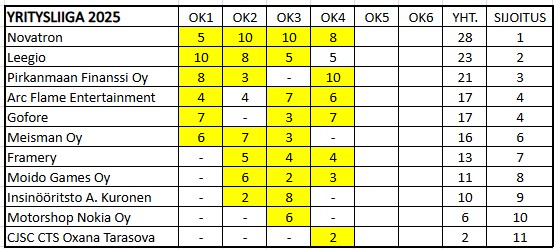 Yritysliigan kokonaistilanne on ao. taulukossa. Tästä linkistä näet tarkemmat osakilpailukohtaiset tulokset.